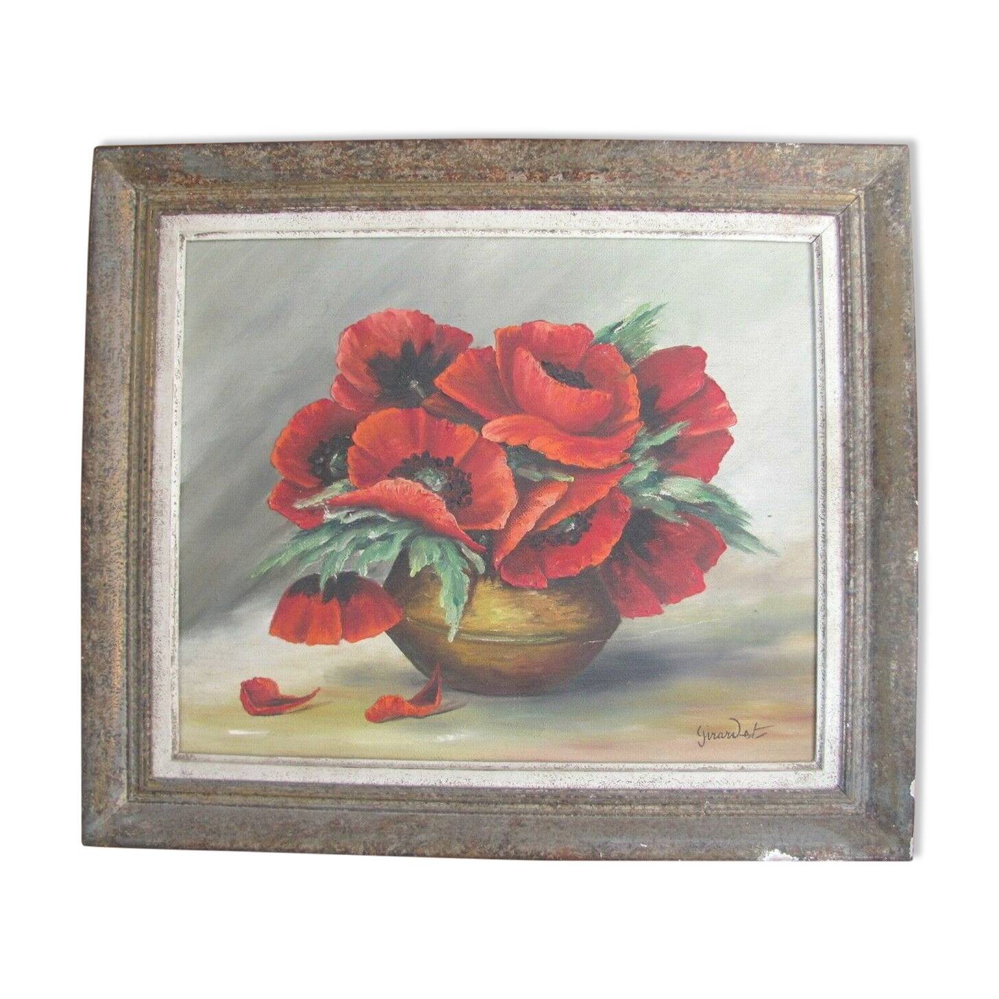 Huile sur toile (45,5x38), bouquets de coquelicots signée girardot, bien encadrée, des imperfections sur le cadre bouquet de coquelicot. Le bouquet de coquelicots,symbole de rêves,signifie ardeur fragile.